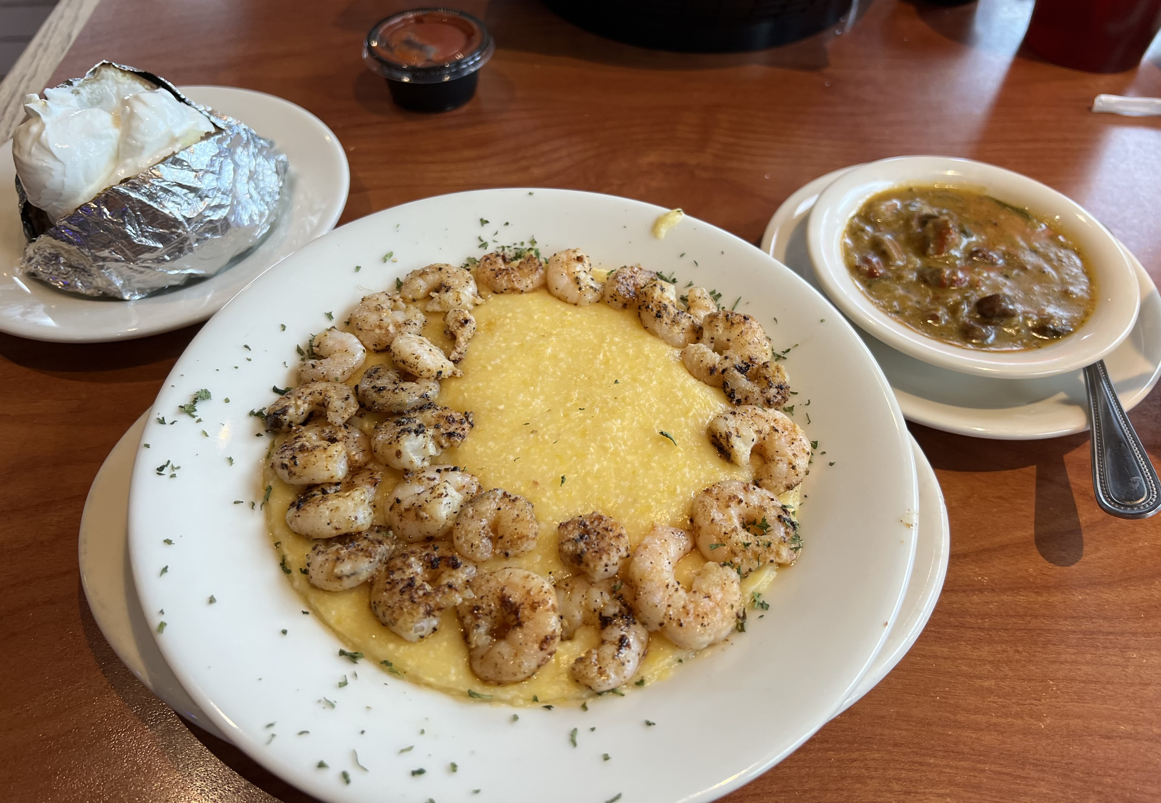 I ordered grilled shrimp and cheese grits, along with a baked potato, which was delicious.